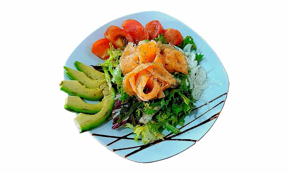 Salmón, tomate, aguacate, aceitunas, eneldo y aderezo de la casa.