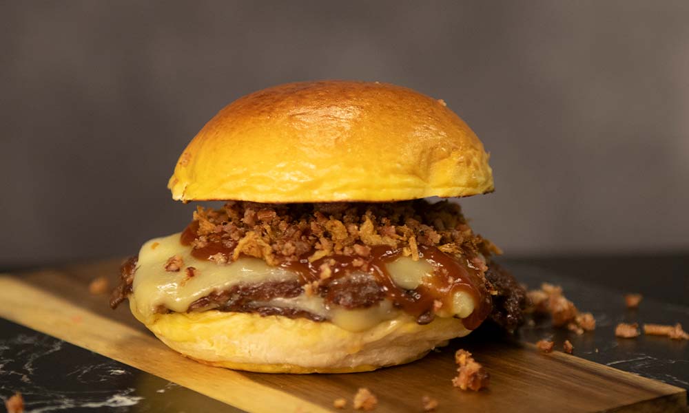 Doble carne smash vaca premium, cebolla crunch, bacon, doble queso gouda y salsa barbacoa en pan brioche «Potato Roll» de Juanito Baker.