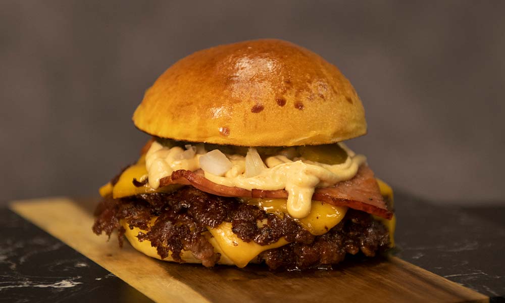Doble carne smash vaca premium, cebolla, pepinillos, doble queso cheddar, bacon y salsa de la casa en pan brioche «Potato Roll» de Juanito Baker.