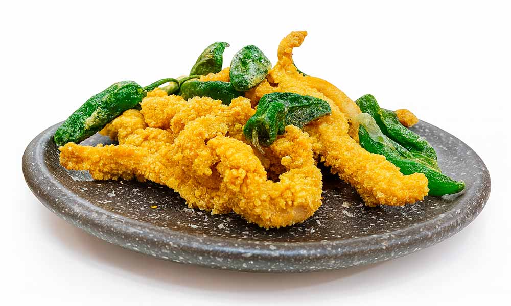 Secreto rebozado, pimientos de padrón y patatas.