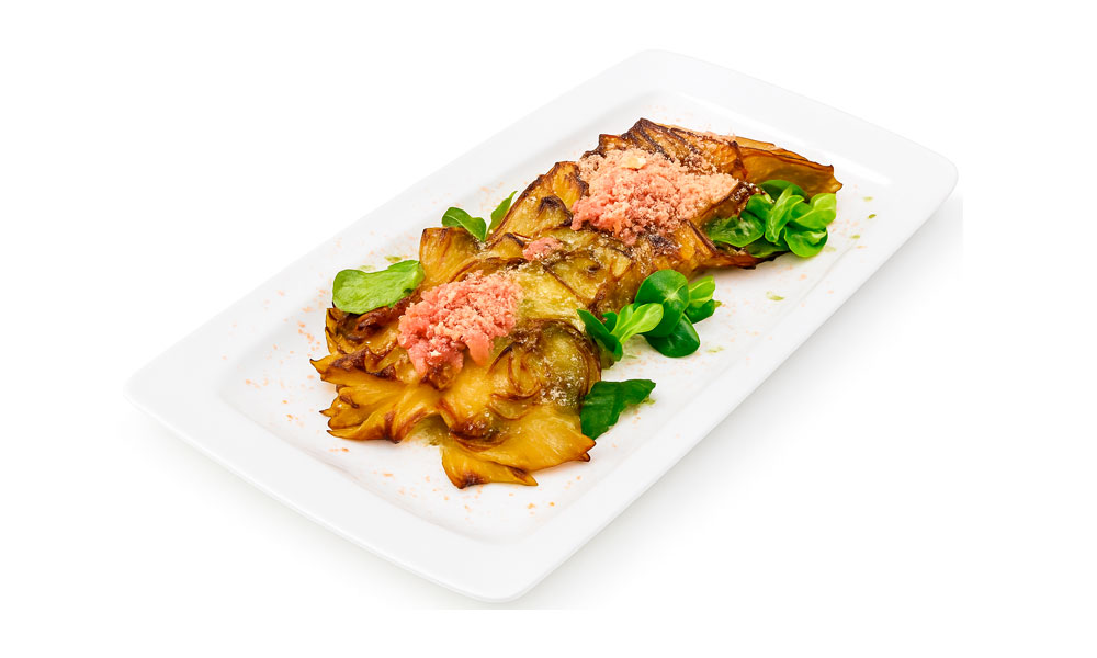 Alcachofa en flor entera en flor entera con taquitos de jamón y foie rallado.