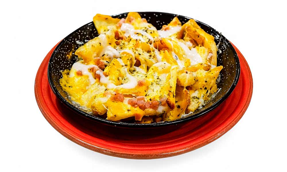 Patatas teja, salsa ranchera, salsa cheddar, bacon a taquitos y mucho queso fundido.