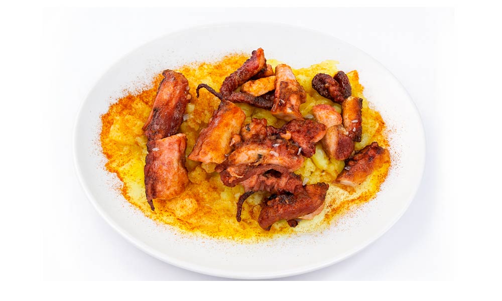 Con cama de patatas al montón, toque de pimentón, sal gorda y oro líquido español.
