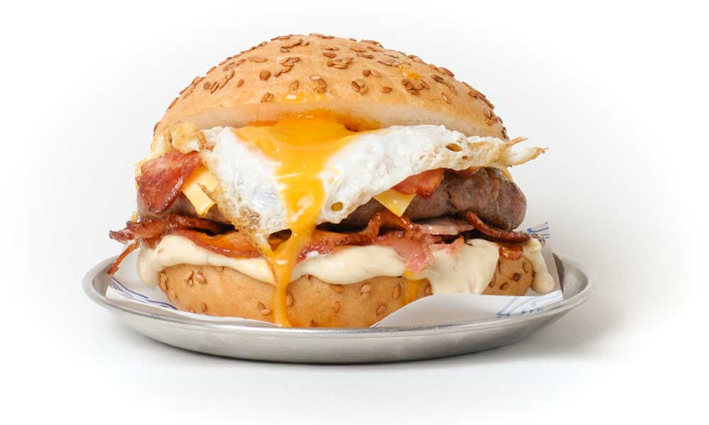 Carne angus jugosa con queso cheddar fundido, bacon crujiente, huevo frito con yema líquida y mahonesa trufada en pan brioche.