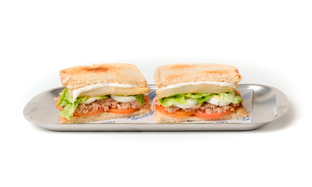 Pan tostado con lechuga fresca, tomate en rodajas, atún, espárragos, huevo cocido y mahonesa cremosa.