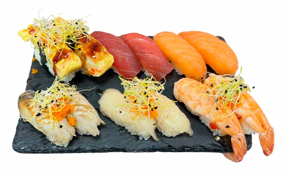 Salmón (2ud), atún (2ud), langostino (2ud), lubina (2ud), caballa (2ud), tamago (2ud).