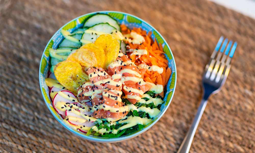 Base a elegir, salmón, teriyaki, sweet mayo, wakame, pepino, zanahoria, rabanillo, sésamo mix y chips de plátano.
