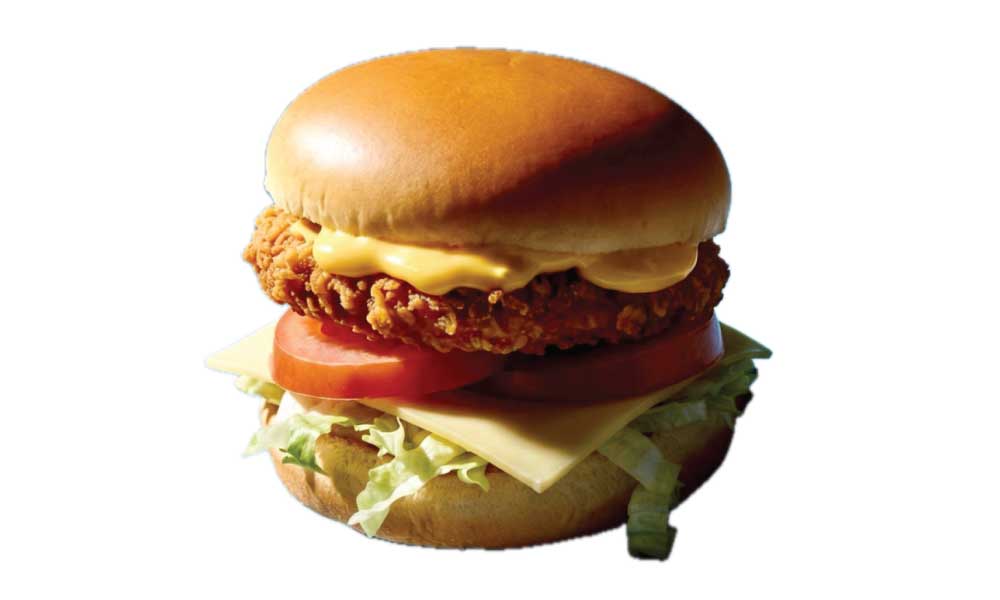 Pollo crispy, lechuga, tomate, queso y salsa cheddar en pan brioche.