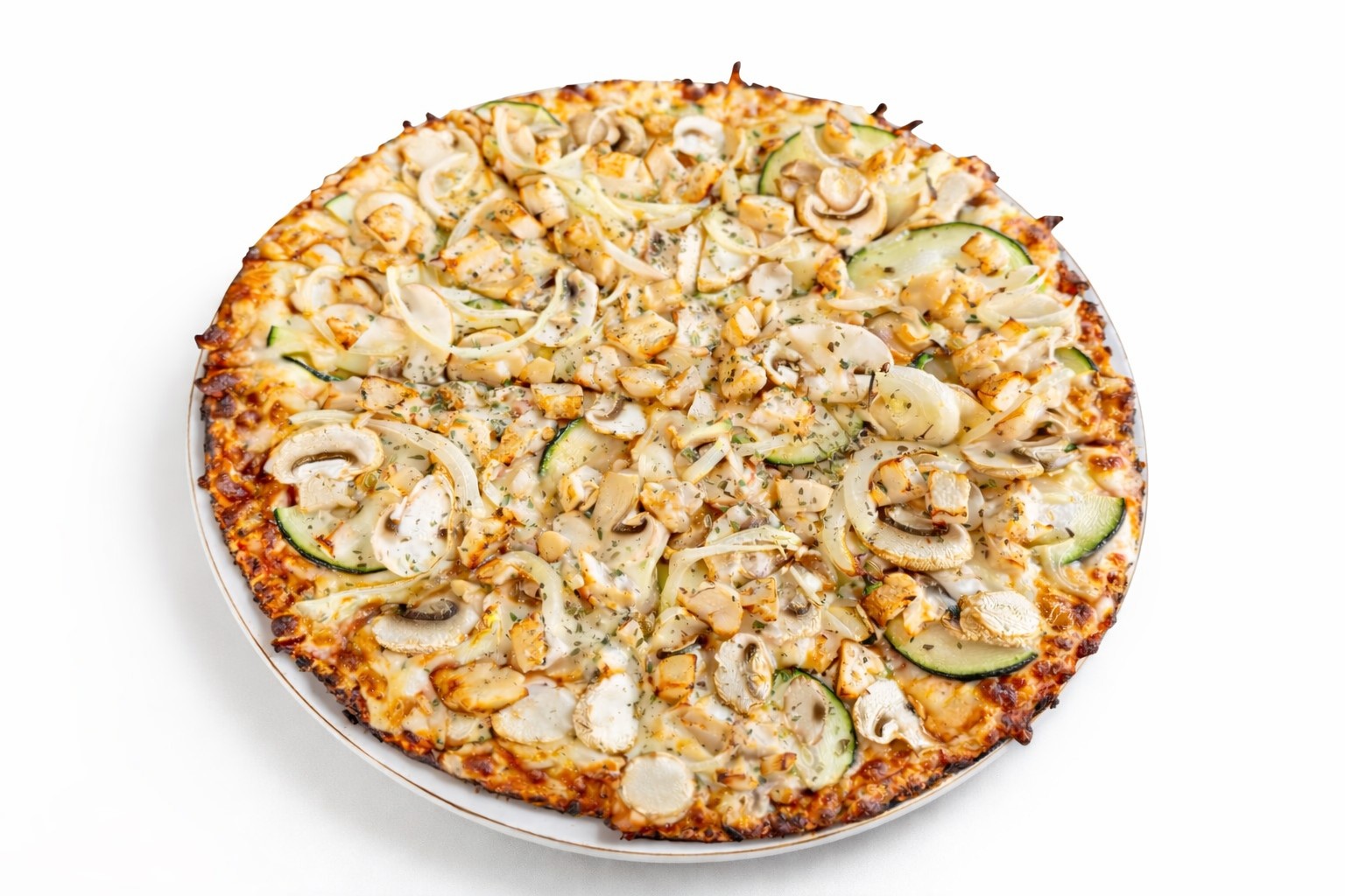 Tomate, mozzarella, calabacín, champiñon, cebolla, claras de huevo, oregano y la proteina a tu gusto