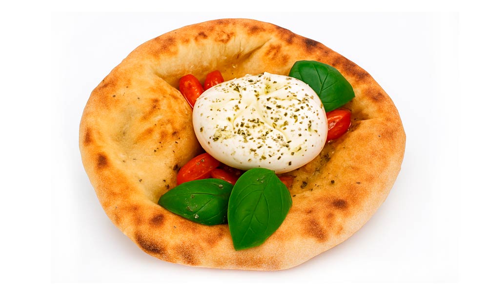 De burrata con parmesano, aceite de oliva virgen extra y albahaca