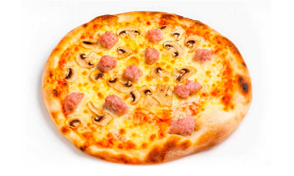 Tomate, mozzarella, champiñón, salchicha fresca, lascas de parmesano, aceite de oliva y orégano