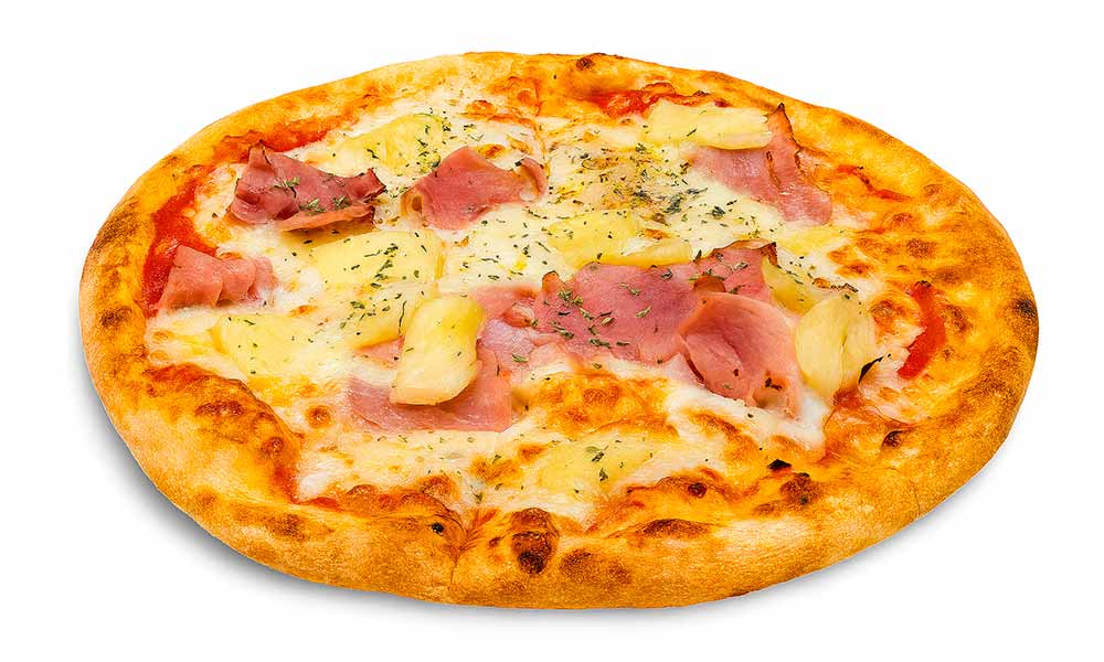 Tomate, mozzarella, prosciutto cotto, piña y orégano