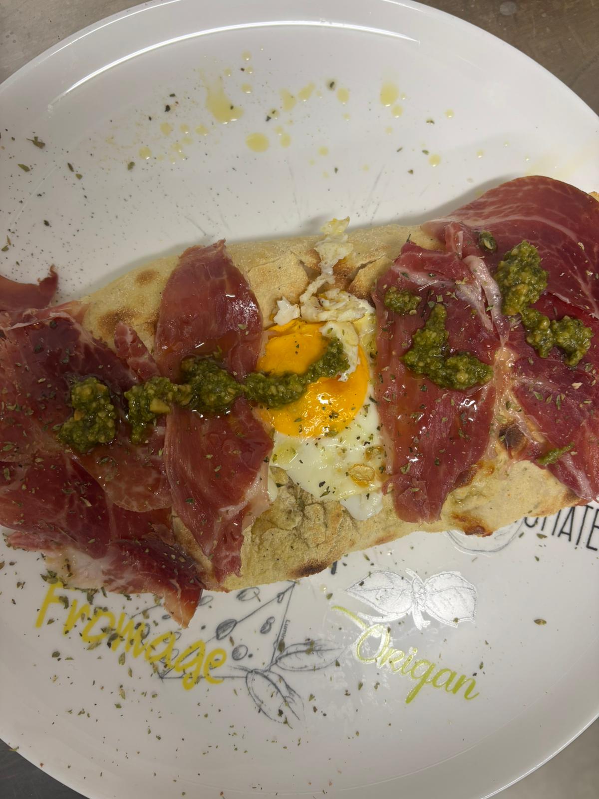 Mozarella, calzone con nata, jamón ibérico, huevo y pesto.