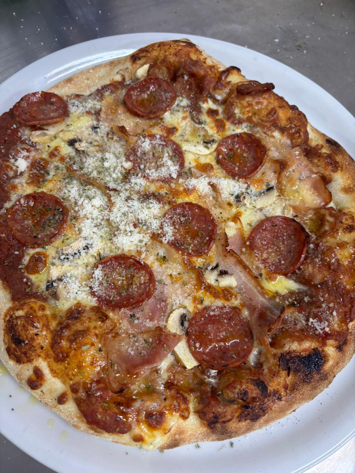 Tomate, Mozarella, Salsa barbacoa con pulled pork, peppeoni, bacon y champiñón.