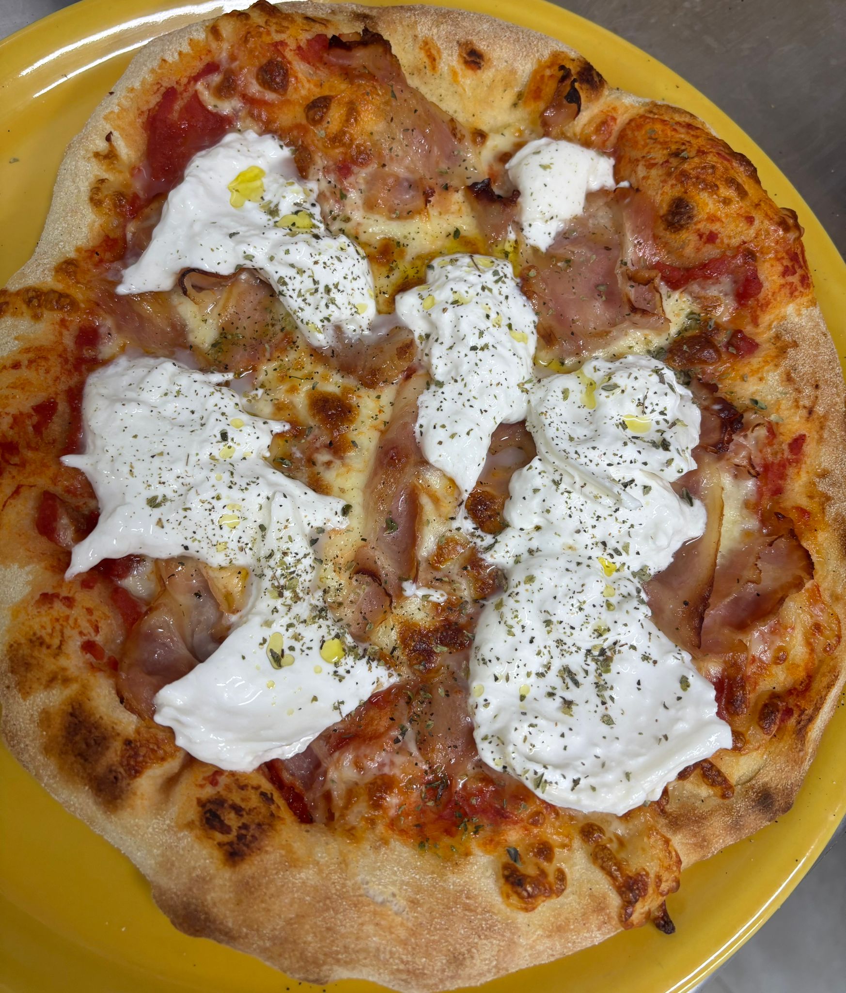 Tomate, Mozzarella, Bacon, Stracciatella y Orégano.