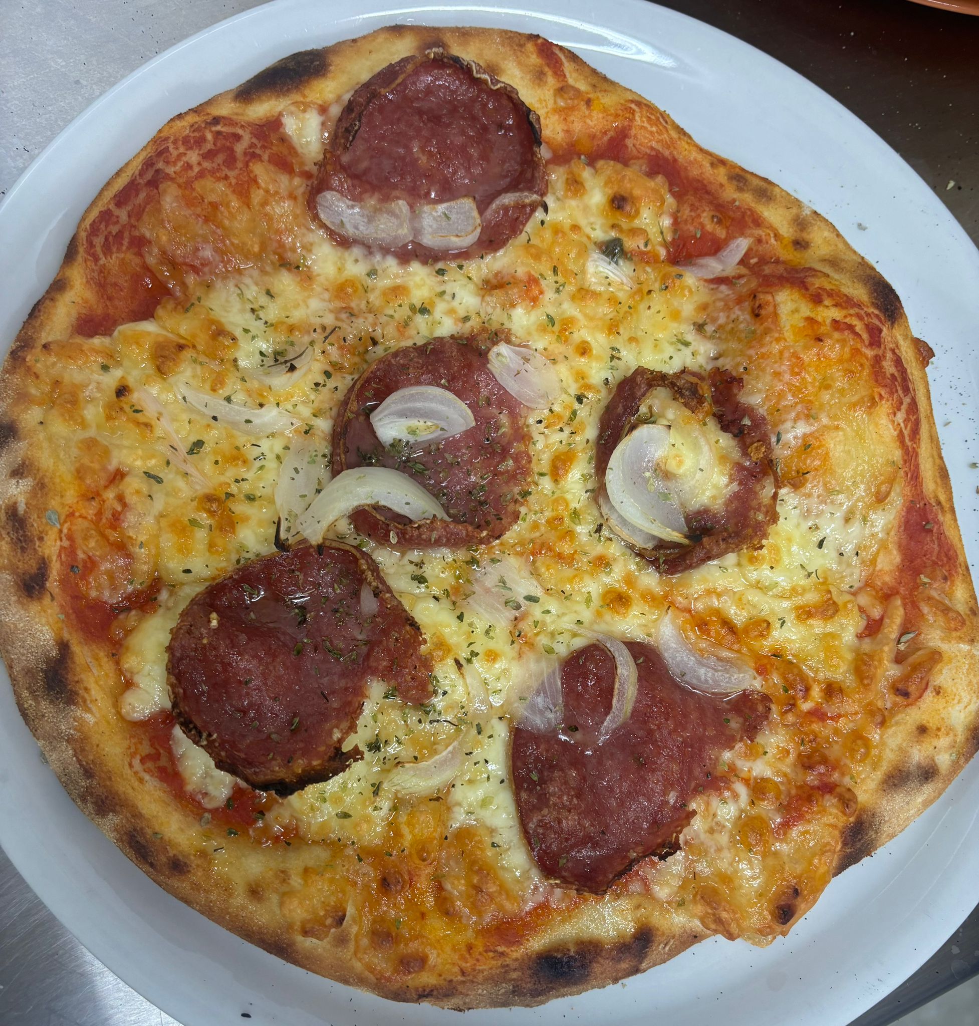Tomate, mozzarella, cebolla, salami Milano, ajo, aceite de oliva, albahaca y orégano