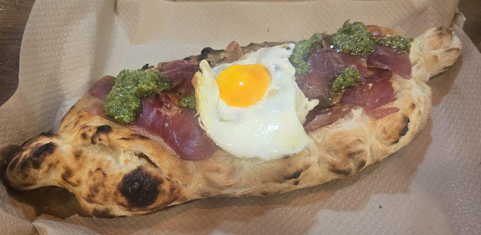Mozzarella, calzone con nata, jamón ibérico, huevo y pesto.