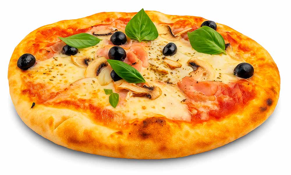 Tomate, mozzarella, bacon, champiñón, aceitunas negras, cebolla, albahaca y orégano