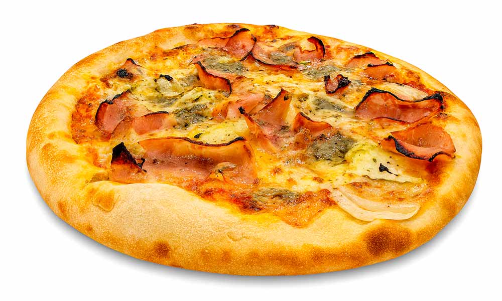 Tomate, mozzarella, gorgonzola, bacon, calabacín y cebolla