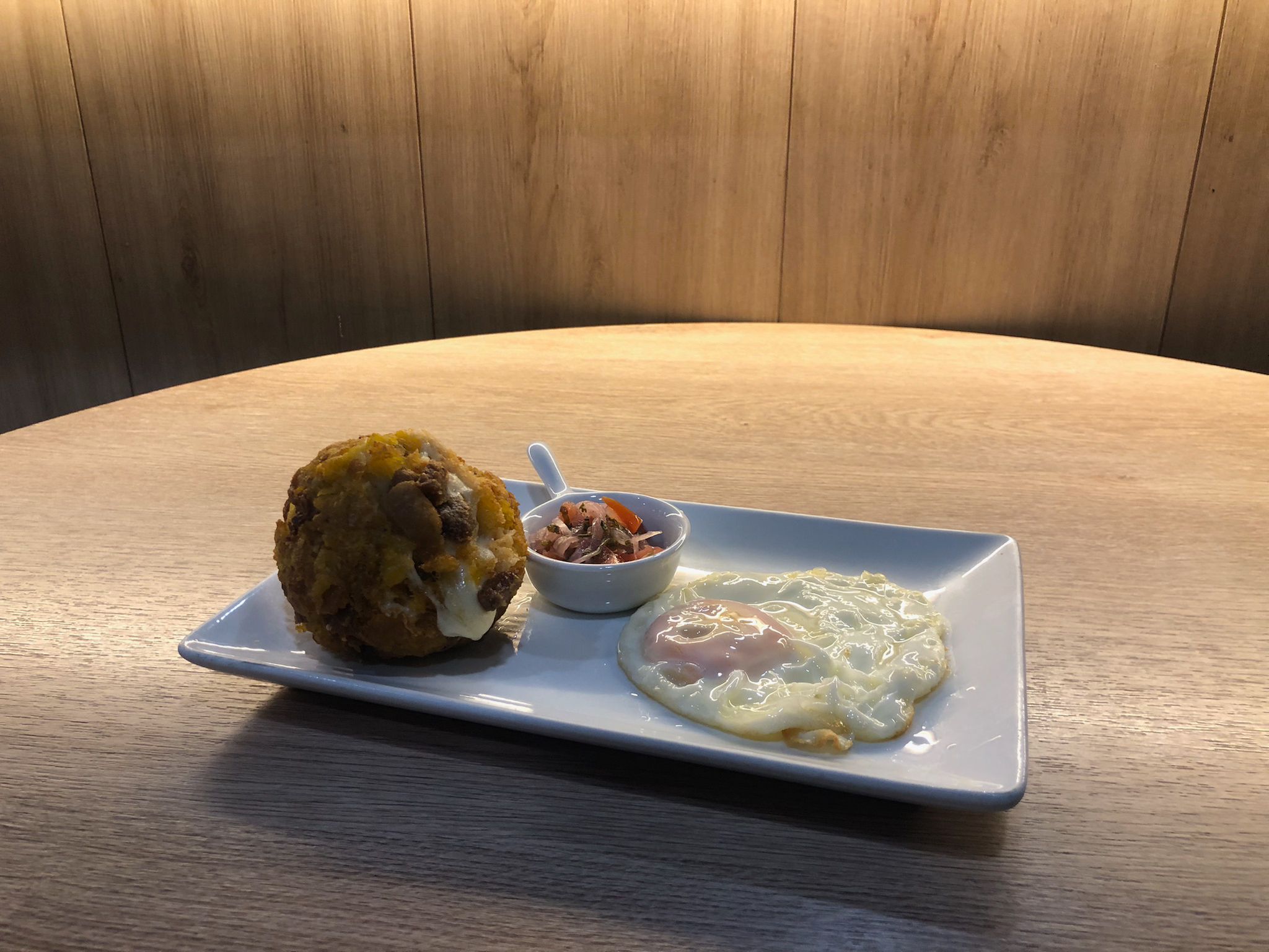 Masa de plátano macho relleno de queso fresco o pequeños tacos de tocino, y acompañado de huevo frito.