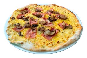 8,50 €Base de nata, bacon, champiñones, emmental y cebolla.