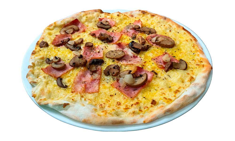 Base de nata, bacon, champiñones, emmental y cebolla.