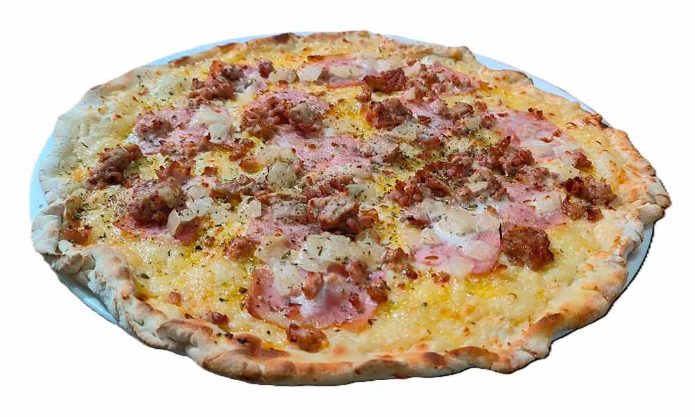 Base de nata, bacon, carne picada, emmental y cebolla.