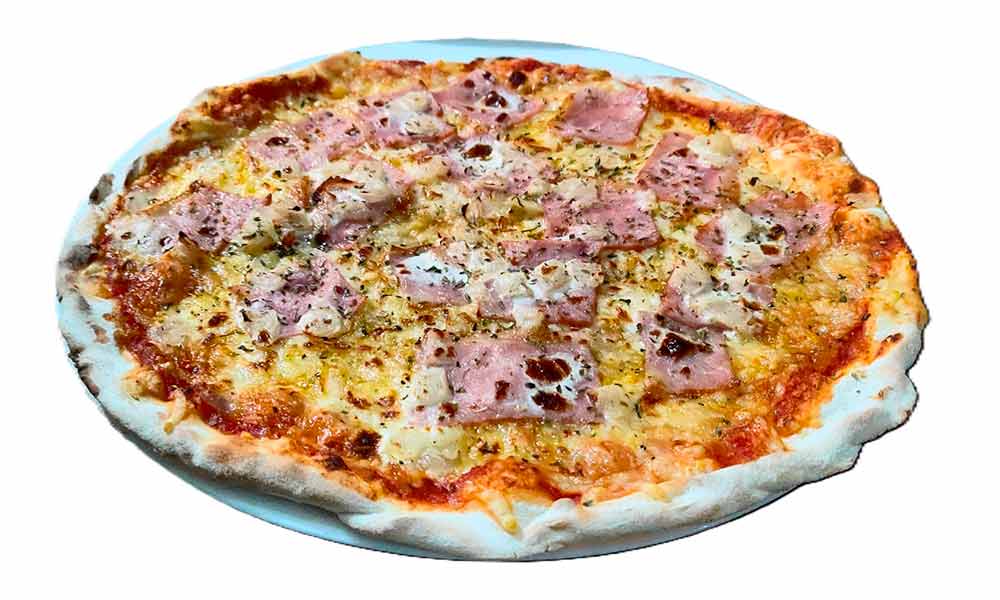 Base de tomate, bacon, emmental, cebolla y cubierta de nata.